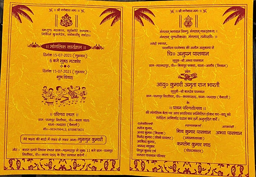 क्षेत्र लोग कुछ नया कर लोगों का ध्यान अपनी ओर आकर्षित करने का प्रयास करते हैं, इसी तरह के कुछ प्रवृत्ति राजनीतिक गलियारों में देखने को मिल रही है आए दिन लोग अपने प्रिय नेता का फोटो कार्ड पर छपवा कर उनके लिए समर्थन जाहिर करते हैं. इस बार ऐसा ही एक मामला सिवान के मोहम्मदपुर से आया है जिसमें विद्यार्थी पासवान नाम के व्यक्ति ने अपने प्रिय नेता का फोटो शादी के कार्ड पर छपवा कर अपने नेता के प्रति प्यार और समर्थन जाहिर किया है.