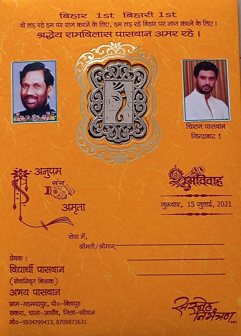 चिराग पासवान और उनकी पार्टी इन दिनों अपने ही पार्टी पर दावेदारी को लेकर चर्चा में हैं इसी बीच लोजपा के एक समर्थक ने उनके नाम से शादी के कार्ड छपवा दिए हैं. 15 जुलाई को शादी सीवान जिले के विद्यार्थी पासवान के बेटे की है, विद्यार्थी पासवान के परिवार ने इस शादी के कार्ड के मुख्य पृष्ठ पर दिवंगत रामविलास पासवान और चिराग पासवान की तस्वीर छपवा रखी है। कार्ड के सबसे ऊपर बिहार फर्स्ट बिहार फर्स्ट का नारा दिया है उसके अगले लाइन में लिखा है। ‘वो लड़ रहे हैं हम पर राज करने के लिए हम लड़ रहे हैं बिहार का नाज करने के लिए’। साथ ही ‘रामविलास पासवान के अमर रहने’ लिखा है। कार्ड को देखकर यह स्पष्ट है की दिवंगत रामविलास पासवान और चिराग पासवान के समर्थक में उनके प्रति दिवानगी को दिखाया है। 15 जुलाई को अनुपम और अमृता की शादी है, जिनके कार्ड पर दिवंगत रामविलास पासवान और चिराग पासवान छाए हुए हैं।